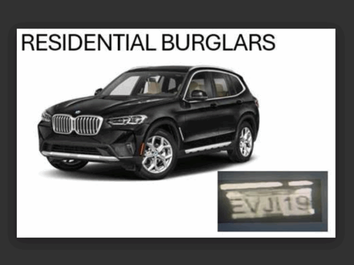 Residents are urged to remain vigilant and report any suspicious activity in their neighborhoods, particularly occupied vehicles parked and left running. A dark-colored BMW X3, believed to be a 2022–2024 model, was identified as a vehicle of interest after being observed on traffic cameras repeatedly circling the area near one of the burglaries. The vehicle appears to be displaying a fake or altered license plate.