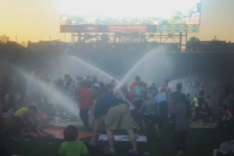 Apparently, it looked like it got rained out, however,that’s not rain. It seems the stadium forgot to turn off the sprinklers that typically water the grass, but instead watered the guest attending the movie.