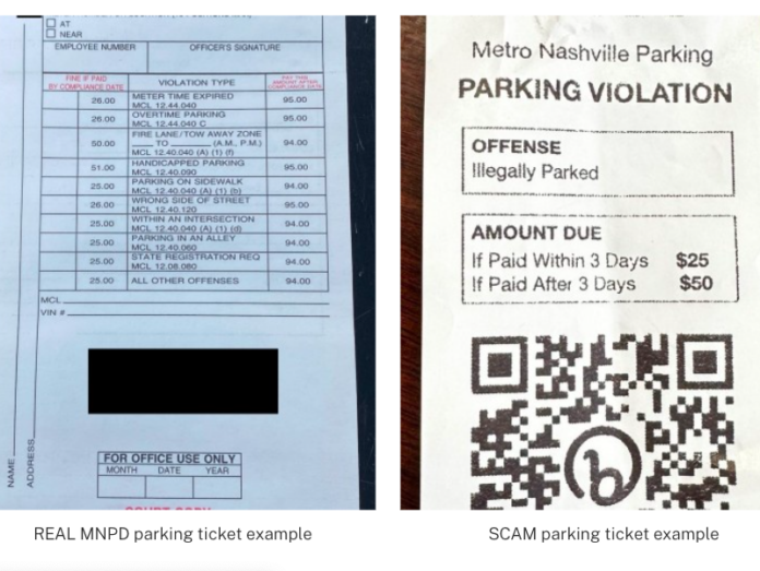 Anyone that may have fallen victim to this scam or sees a ticket like this on their vehicle should call 615-862-8600 and report it to a Fraud Unit detective.
