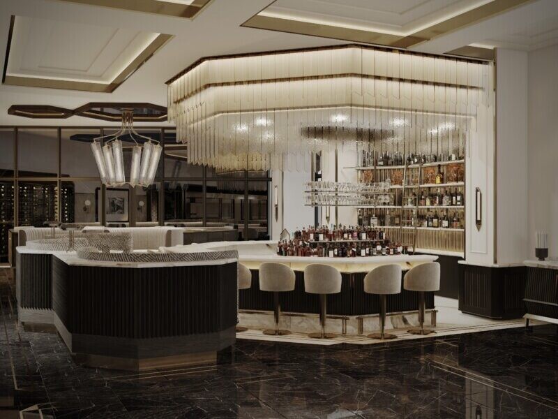 The centerpiece bar showcases a custom hand-finished reeded glass chandelier and is surrounded by elevated bar booths, creating an intimate but lively space, blending community with sophistication.
