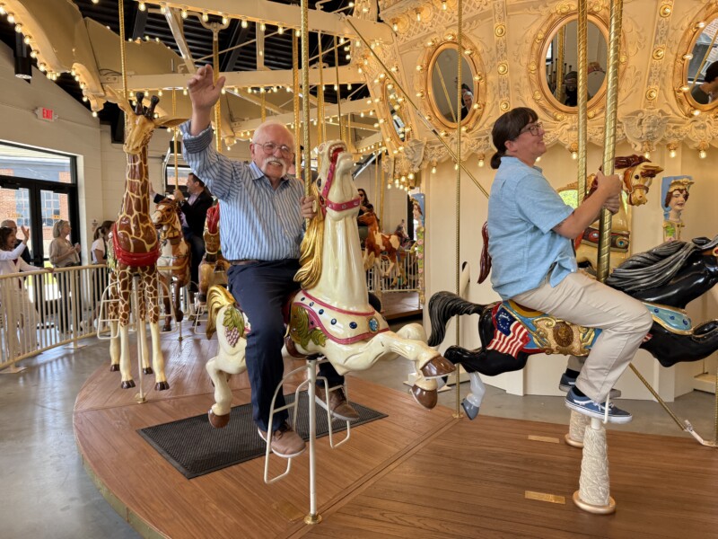 Several community leaders spoke at the event and the message was clear – don’t give up on your dream even if it might take 30 years. Ken Means, the mastermind behind the carousel, has been handcrafting each of the animals for this carousel for 30 years, hoping one day to complete it and find the right place for it to be installed. Now, Franklin will be home to one of just 200 carousels in the country. After the ribbon cutting, Means, along with community leaders took the first ride on the carousel. We asked Means if he ever gets tired of riding the carousel and with a big smile, he said I never get tired of it.