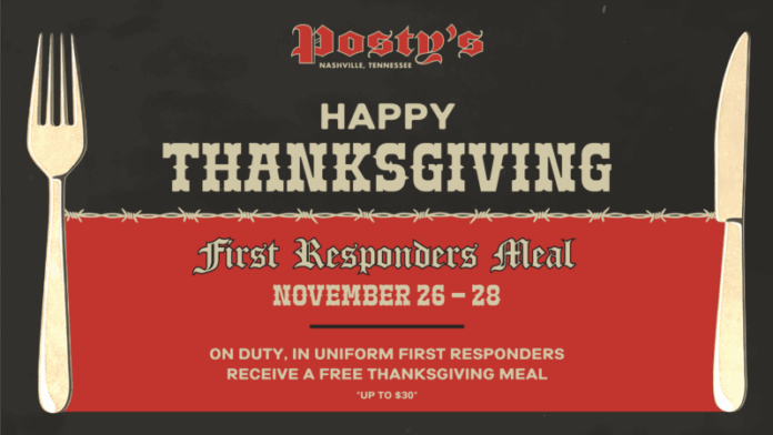 In uniform, on-duty first responders can enjoy a free meal up to $30 at Jason Aldean’s Nashville (307 Broadway) and Posty’s (305 Broadway) from November 26 – November 28, available for dine-in and take-out.