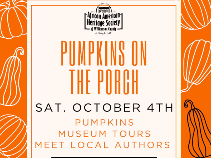 The African American Heritage Society of Williamson County will host its 2nd Annual “Pumpkins on the Porch” event on Saturday, October 4, 2025, from 10:00 a.m. to 12:00 p.m. at the Harvey McLemore House Museum. This family-friendly community event, celebrates the museum’s rich history while offering visitors the chance to purchase seasonal pumpkins, enjoy complimentary breakfast sandwiches from Hattie B’s Hot Chicken (Franklin location), and savor coffee from Starbucks at Five Points and doughnuts provided by Tiny Little Donuts. Guests will be able to take free guided tours of the museum and learn about Harvey McLemore, a formerly enslaved person whose agricultural legacy included growing Indian corn—a perfect addition to fall décor.