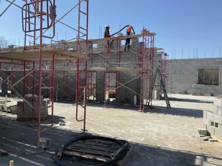 The building pad for the classroom addition is complete, and footings have begun. A subcontractor will begin installing concrete masonry units at the beginning of March, and underground plumbing rough-in installation has started.