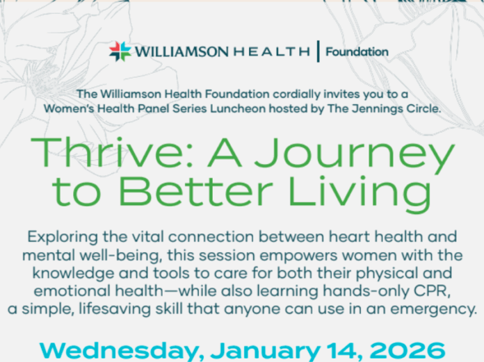 The Williamson Health Foundation, the philanthropic arm of Williamson Health, is proud to present the first Women’s Health Panel Series Luncheon of 2026: “Thrive: A Journey to Better Living.” The January event will explore the vital connection between heart health and mental well-being. Attendees will gain important knowledge and tools to care for both their physical and emotional health, while also learning the simple, lifesaving skill of hands-only CPR.